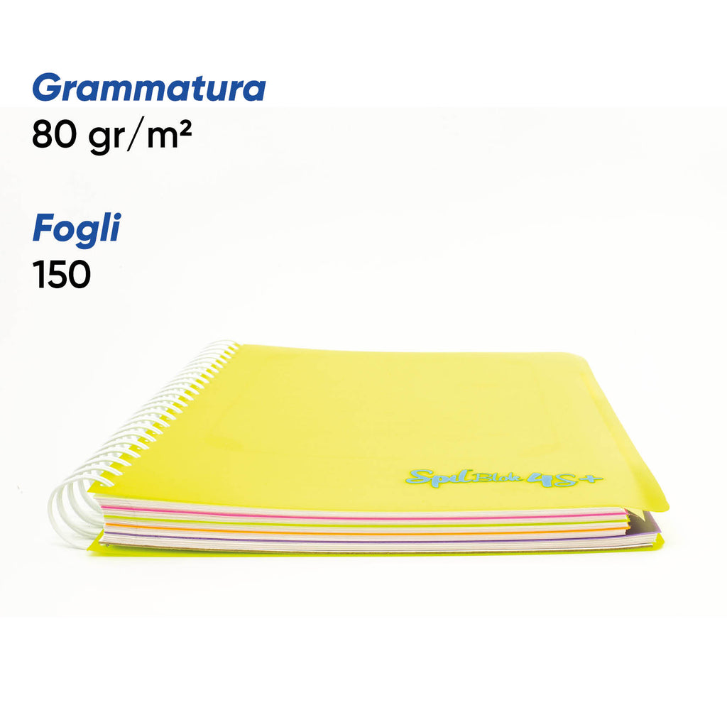 Quaderno formato 22.5 x 29.7 copertina in PP cartoncino posteriore 900 grammi spirale in metallo plastificato 150 fogli di carta 80 grammi e 5 separatori in PP fissi.