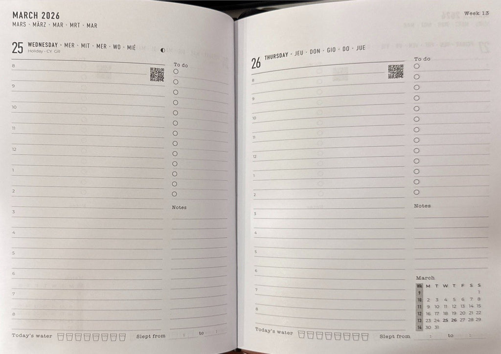 Presenta un'elegante goffratura della data in tinta e una pratica chiusura elastica per conservare facilmente gli appunti.