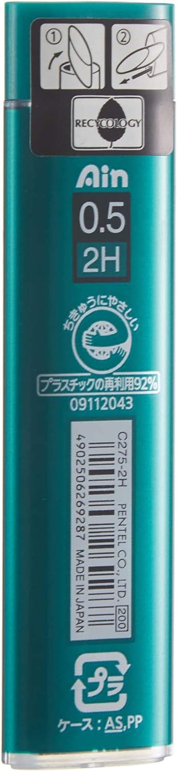 PENTEL Mine portamatite AINSTEIN 0.5mm C275-2H 40 pezzi 2H.Grazie alla struttura cellulare in ceramica le ricariche Ain Stein sono ancora più resistenti e quindi più resistenti alla rottura. Latta con pratico tappo a vite per una facile estrazione delle mine.Stagno con 40 mine.In una lattina colorata.Il prodotto RECYCOLOGY è costituito per il 92% da materiale riciclato.
