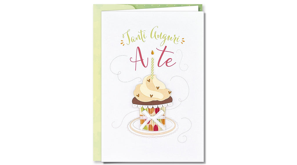 Biglietto d'auguri decorato da speciali applicazioni di carta paillettes e fantasie.
